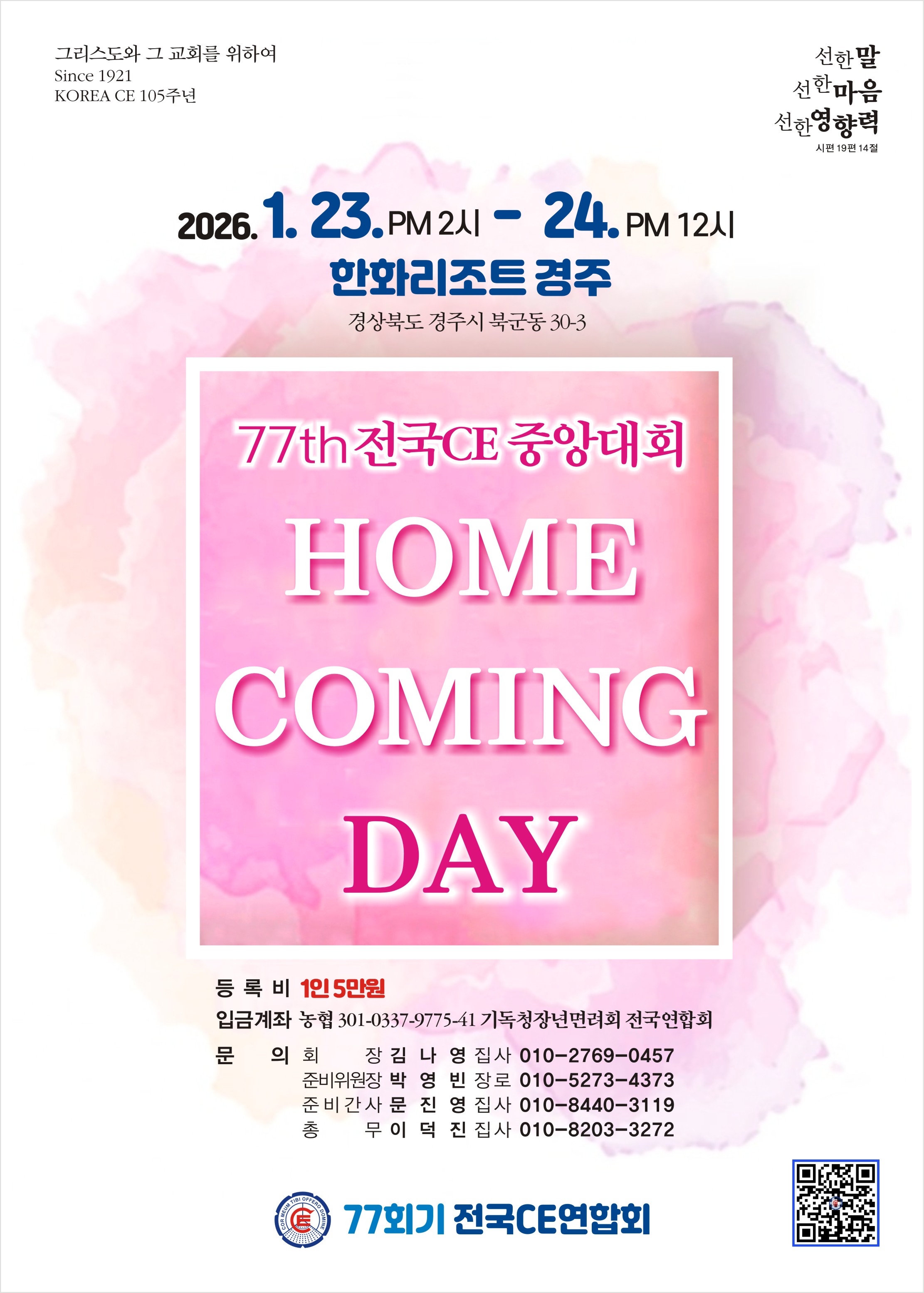 2026년 새해가 밝았습니다. 전국CE연합회는2026년 중앙대회를 '고향가는 날'로 준비하였습니다. 모든 중앙위원들,CE동지회, 로컬회장,임원들과 함께 로컬의 CE미래인재들을 초청하여 CE맨들의 하나됨, 함께함, 동지애를 느끼며, 옛이야기를 나누며 77회기전국CE출범을 함께 기뻐하고 축하하며 기도하는 자리를 마련하고자합니다. 꼭 오셔서 자리를 빛내주시기 바랍니다.