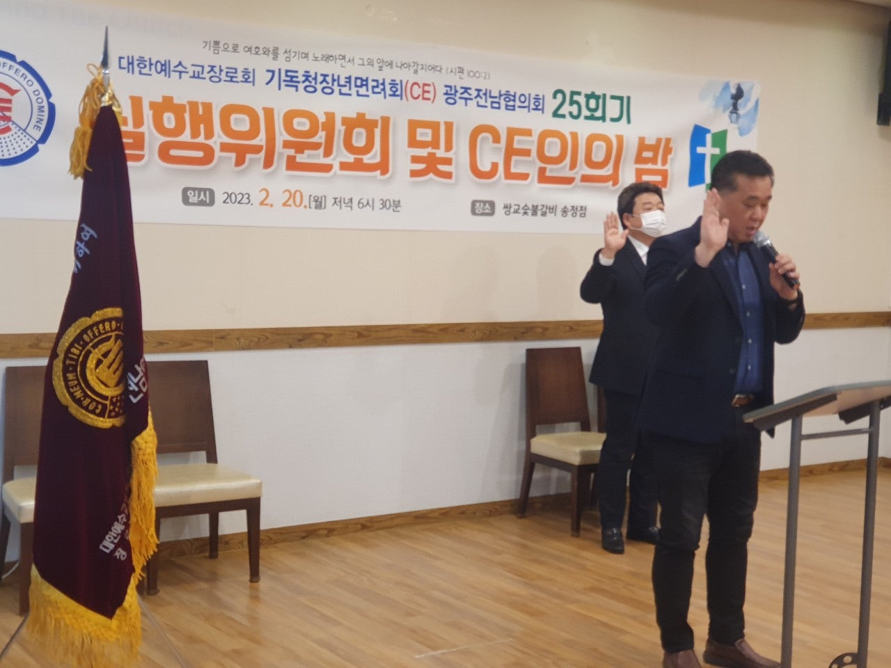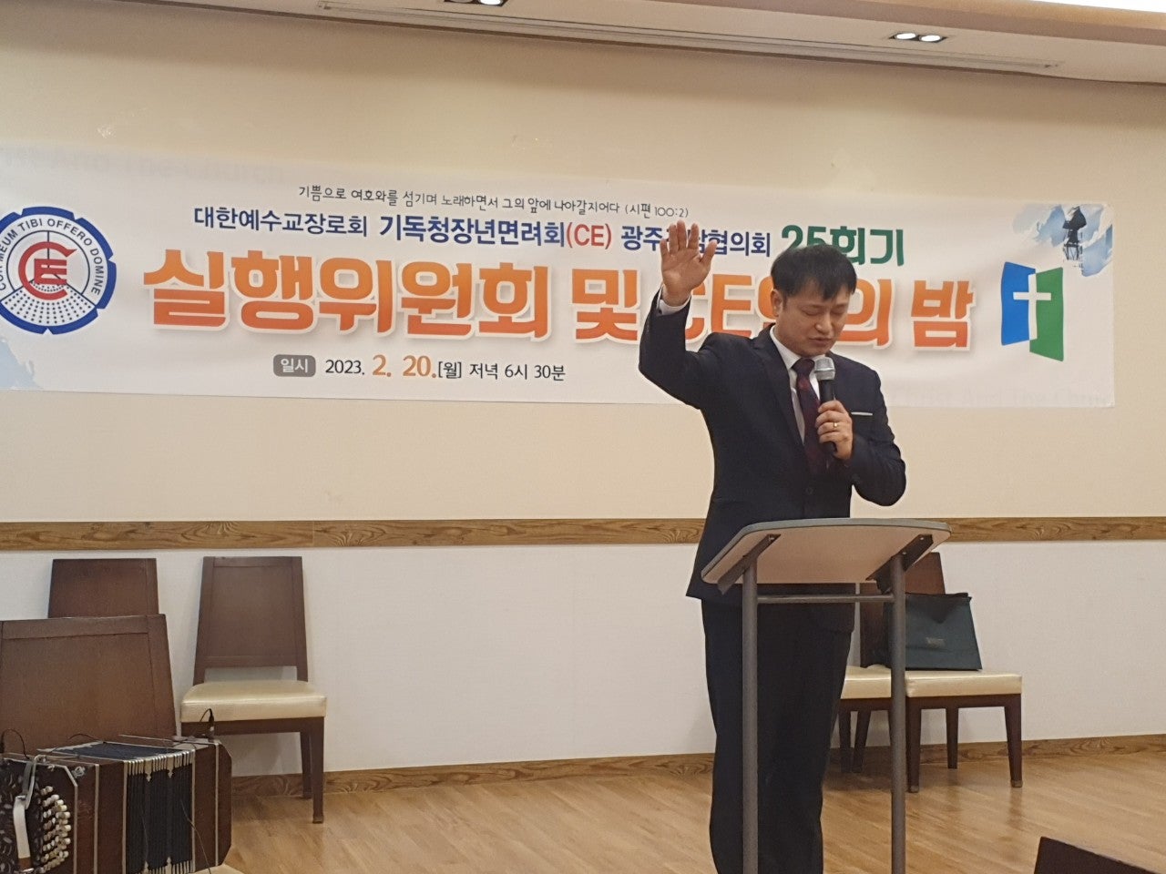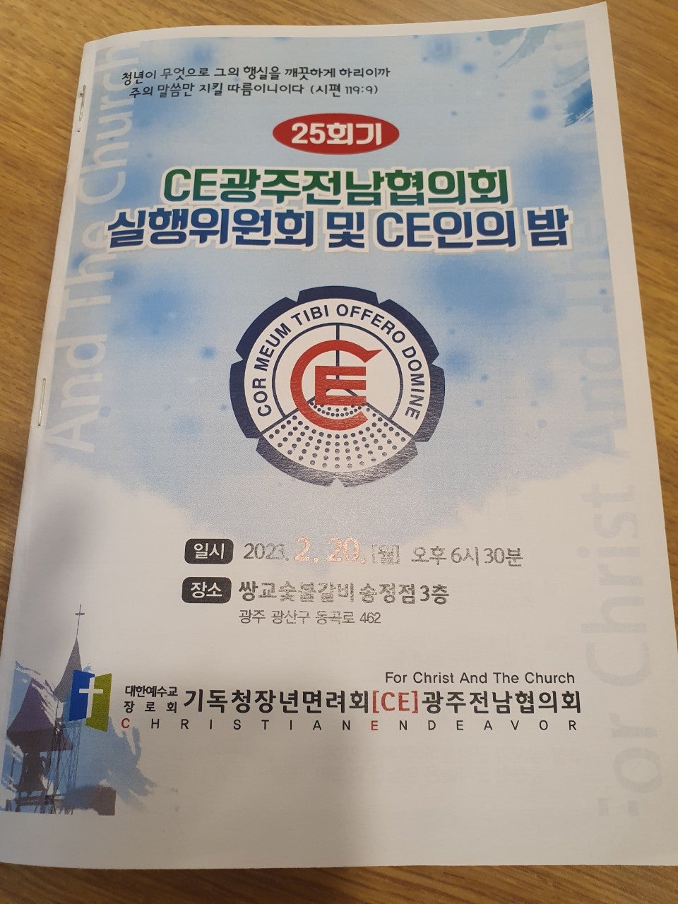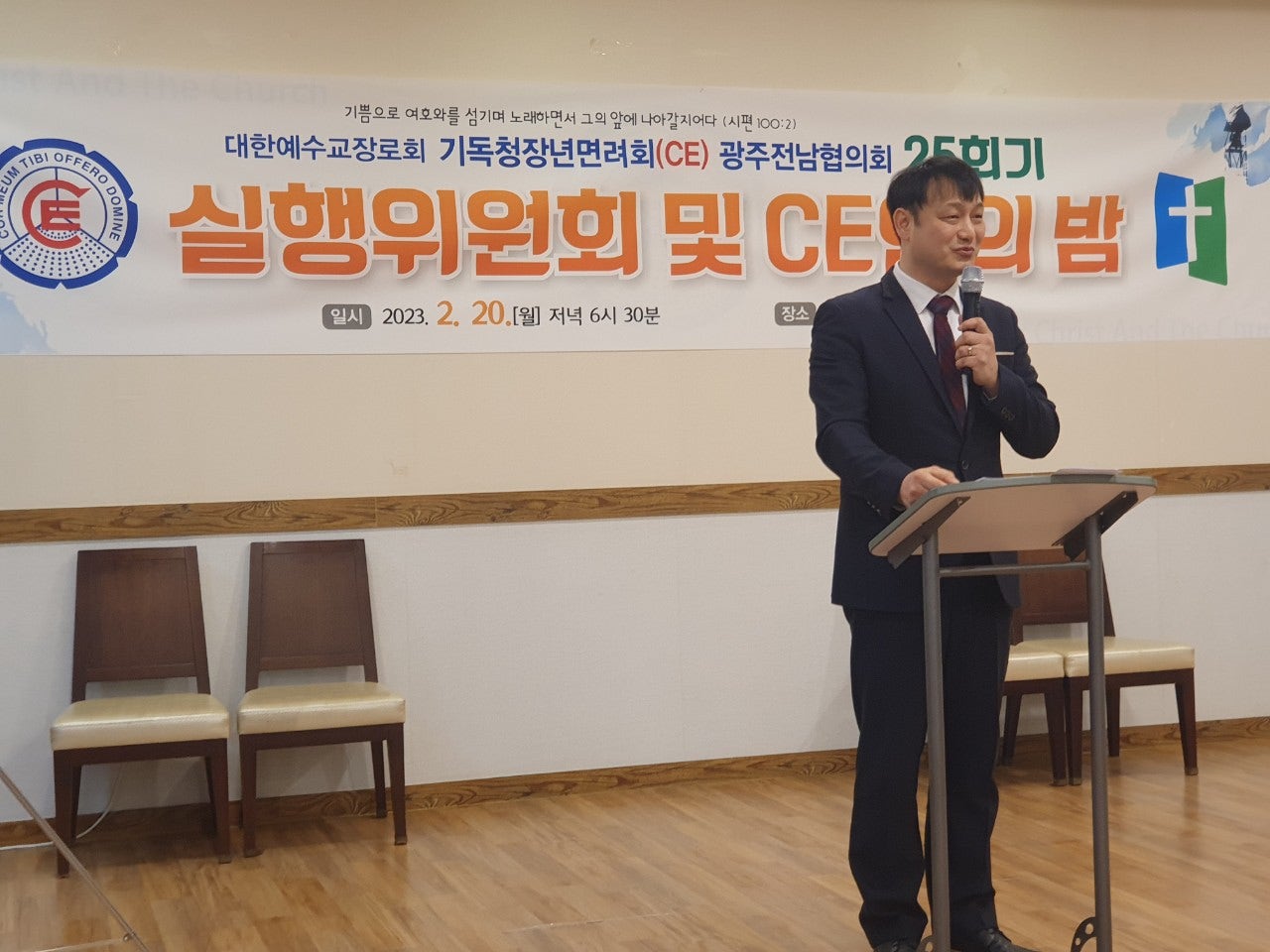 ♤25회기 광주전남CE협의회 실행위원회 및 CE인의 밤♤ 일시: 2023년2월20일(월) 오후6시30분 장소: 쌍교 숯불갈비 송정점3층 광주시 광산구 동곡로 462 1부 예배 인도: 부회장 김관중 장로(송정중앙) CE강령 및 3대 결의 제창: 김영삼 집사(광주영천) 기도: 증경회장 김복수 장로(나주성만) 성경봉독: 회의록서기 이덕진 집사(송정중앙) 설교: 마태복음 5장13절~16절 "소금과 빛의 의미" -마영진 선교사(탄자니아)- 헌금기도: 회계 이은영 집사(영광대) 헌금특송: 반도네온 김태은 축사: 전국CE회장 김재규 집사 축도: 마영진 선교사(탄자니아) 2부 회무처리 사회: 회장 강성심 집사(영광대) 기도:지도위원 심완구 장로(송정중앙) 회원점명: 서기 허옥선 집사(광주세광) 광고: 총무 한광희 집사(송정중앙) 74회 기독청장년면려회 전국연합회 회장 김재규 집사 서기 전정하 장로 총무 박명일 장로 |