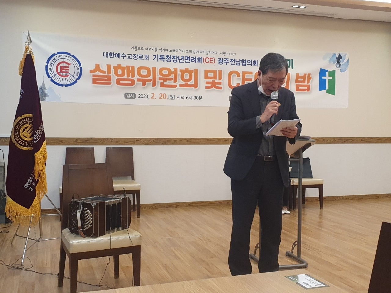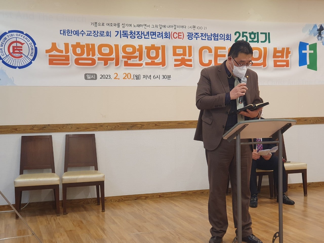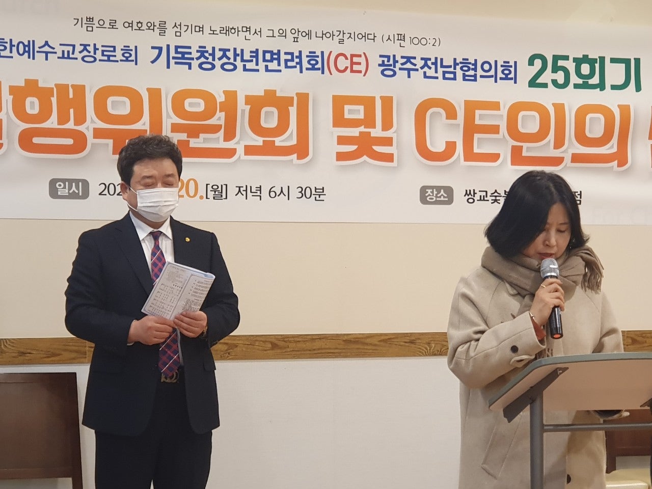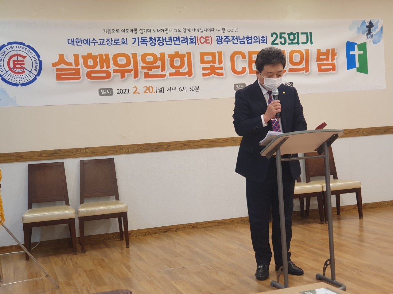 ♤25회기 광주전남CE협의회 실행위원회 및 CE인의 밤♤ 일시: 2023년2월20일(월) 오후6시30분 장소: 쌍교 숯불갈비 송정점3층 광주시 광산구 동곡로 462 1부 예배 인도: 부회장 김관중 장로(송정중앙) CE강령 및 3대 결의 제창: 김영삼 집사(광주영천) 기도: 증경회장 김복수 장로(나주성만) 성경봉독: 회의록서기 이덕진 집사(송정중앙) 설교: 마태복음 5장13절~16절 "소금과 빛의 의미" -마영진 선교사(탄자니아)- 헌금기도: 회계 이은영 집사(영광대) 헌금특송: 반도네온 김태은 축사: 전국CE회장 김재규 집사 축도: 마영진 선교사(탄자니아) 2부 회무처리 사회: 회장 강성심 집사(영광대) 기도:지도위원 심완구 장로(송정중앙) 회원점명: 서기 허옥선 집사(광주세광) 광고: 총무 한광희 집사(송정중앙) 74회 기독청장년면려회 전국연합회 회장 김재규 집사 서기 전정하 장로 총무 박명일 장로 |