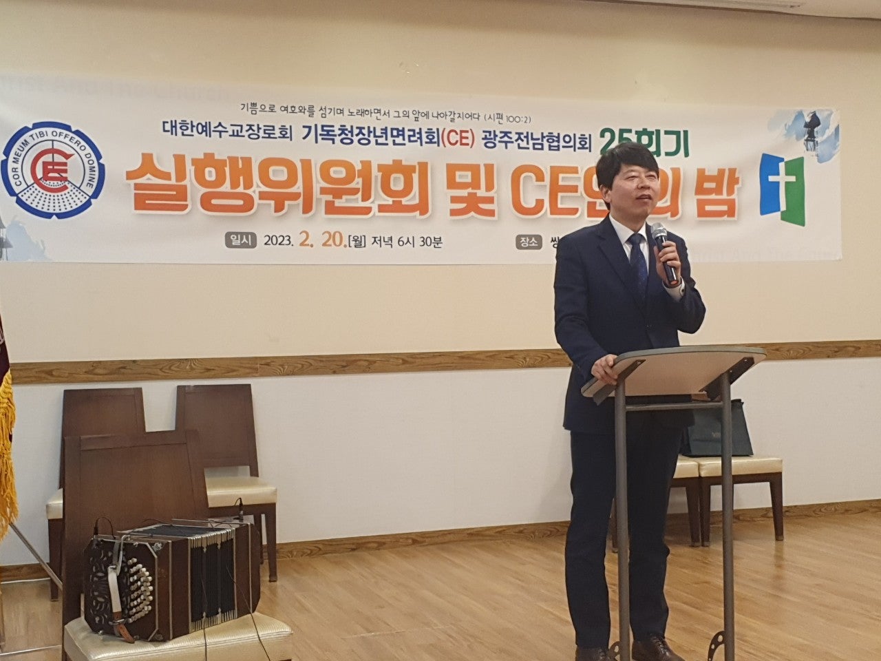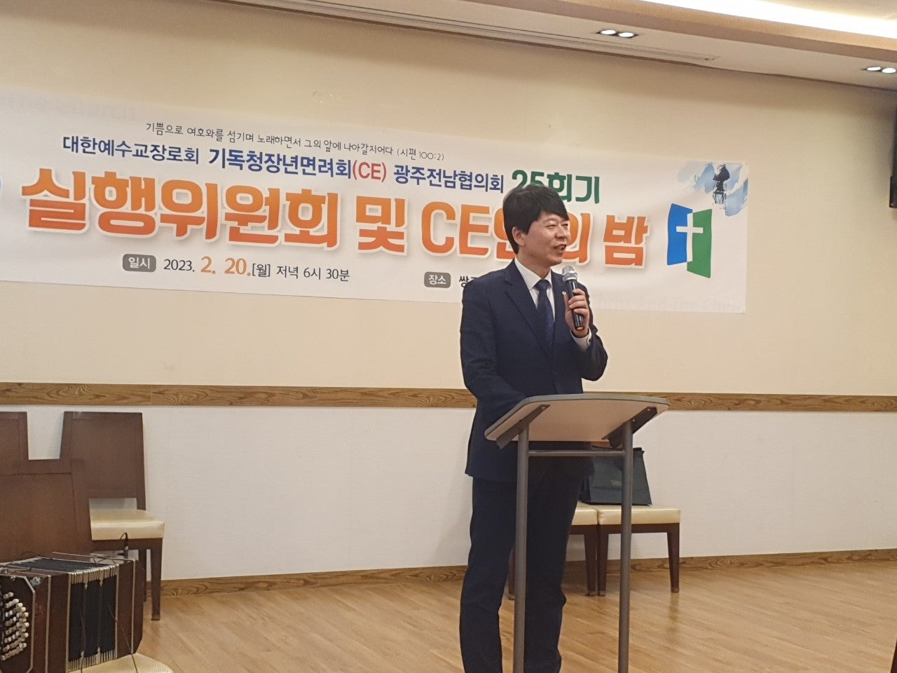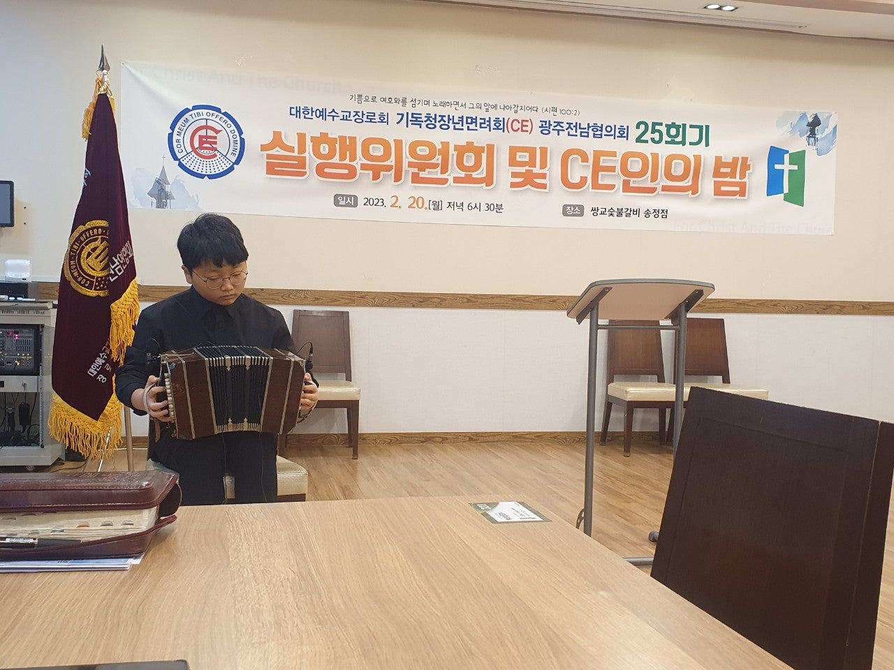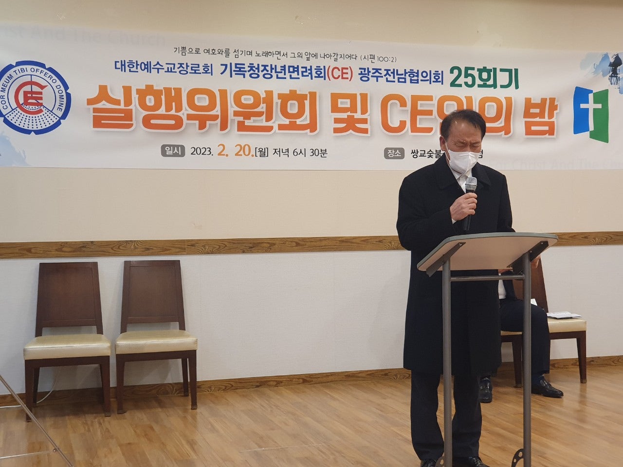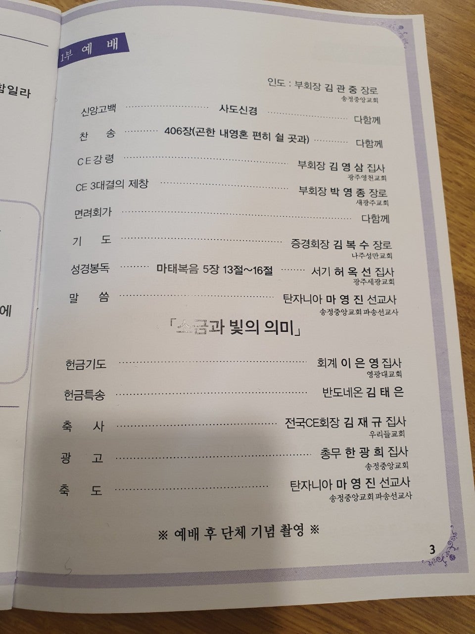 ♤25회기 광주전남CE협의회 실행위원회 및 CE인의 밤♤ 일시: 2023년2월20일(월) 오후6시30분 장소: 쌍교 숯불갈비 송정점3층 광주시 광산구 동곡로 462 1부 예배 인도: 부회장 김관중 장로(송정중앙) CE강령 및 3대 결의 제창: 김영삼 집사(광주영천) 기도: 증경회장 김복수 장로(나주성만) 성경봉독: 회의록서기 이덕진 집사(송정중앙) 설교: 마태복음 5장13절~16절 "소금과 빛의 의미" -마영진 선교사(탄자니아)- 헌금기도: 회계 이은영 집사(영광대) 헌금특송: 반도네온 김태은 축사: 전국CE회장 김재규 집사 축도: 마영진 선교사(탄자니아) 2부 회무처리 사회: 회장 강성심 집사(영광대) 기도:지도위원 심완구 장로(송정중앙) 회원점명: 서기 허옥선 집사(광주세광) 광고: 총무 한광희 집사(송정중앙) 74회 기독청장년면려회 전국연합회 회장 김재규 집사 서기 전정하 장로 총무 박명일 장로 |