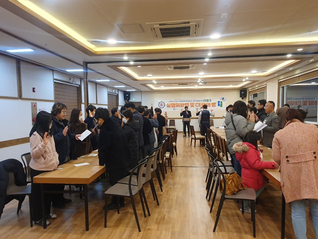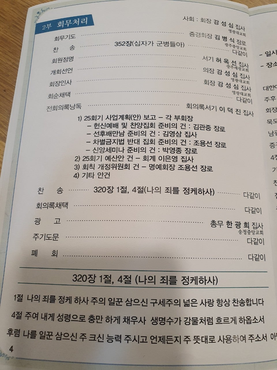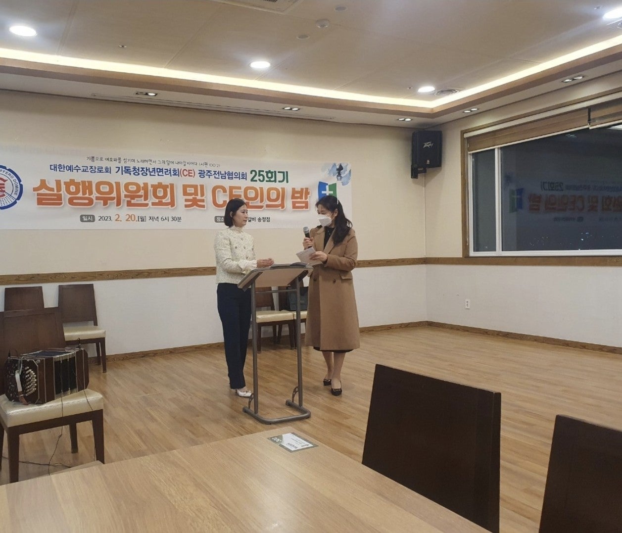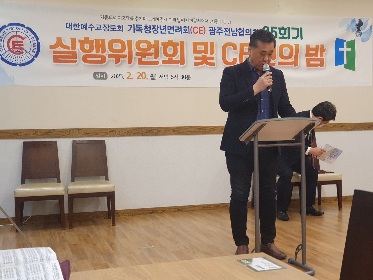 ♤25회기 광주전남CE협의회 실행위원회 및 CE인의 밤♤ 일시: 2023년2월20일(월) 오후6시30분 장소: 쌍교 숯불갈비 송정점3층 광주시 광산구 동곡로 462 1부 예배 인도: 부회장 김관중 장로(송정중앙) CE강령 및 3대 결의 제창: 김영삼 집사(광주영천) 기도: 증경회장 김복수 장로(나주성만) 성경봉독: 회의록서기 이덕진 집사(송정중앙) 설교: 마태복음 5장13절~16절 "소금과 빛의 의미" -마영진 선교사(탄자니아)- 헌금기도: 회계 이은영 집사(영광대) 헌금특송: 반도네온 김태은 축사: 전국CE회장 김재규 집사 축도: 마영진 선교사(탄자니아) 2부 회무처리 사회: 회장 강성심 집사(영광대) 기도:지도위원 심완구 장로(송정중앙) 회원점명: 서기 허옥선 집사(광주세광) 광고: 총무 한광희 집사(송정중앙) 74회 기독청장년면려회 전국연합회 회장 김재규 집사 서기 전정하 장로 총무 박명일 장로 |