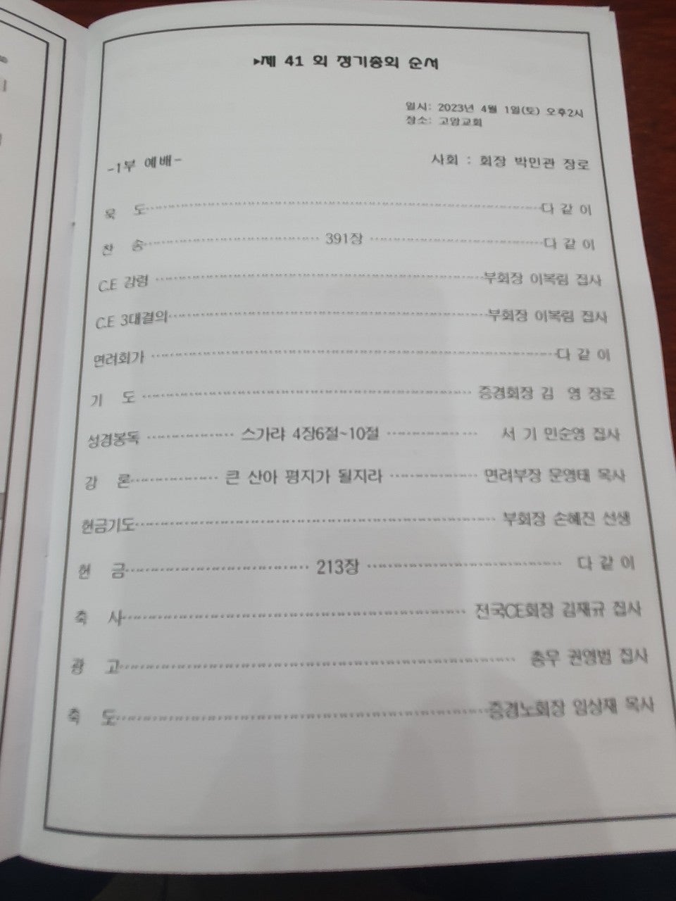 ♤41회기 충북동CE 정기총회♤ 일시: 주후2023년4월1일(토) 오후2시 장소: 고암교회(임상재 목사시무) 충북 제천시 의림대로 42길 90ㅣ 1부 예배 인도: 회장 박민관 장로 CE강령 및 3대 결의제창: 부회장 이복림집사 기도: 증경회장 김영 장로 성경봉독: 서기 민순영 집사 설교: 스가랴4장6절~10절 "큰 산아 평지가 될지라" 충북동노회 면려부장 문영태 목사 헌금기도: 부회장 손혜진 자매 축사: 전국CE 회장 김재규 집사 광고: 총무 권영범 집사 축도: 임상재 목사(고암) 74회기 기독청장년면려회 전국연합회 회장 김재규 집사 서기 전정하 장로 총무 박명일 장로 #로컬행사 |