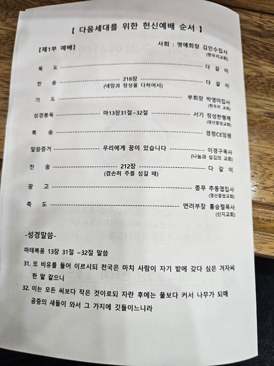 기독청장년면려회 경청노회연합회 예배 인도: 명예회장 김인수 집사 (한우리) 기도:부회장 박영미 집사(한우리) 성경봉독:서기 정성한 형제 (경산중앙) 특송: 경청CE 임원 설교: 마태복음 13장31절~32절 "우리에게 꿈이 있습니다" -이경구 목사(나눔과 섬김의 교회)- 광고: 총무 추동엽 집사(경산중앙) 교회 광고: 권희찬 목사(자인) 축도:면려부장 홍승렬 목사(신지) |