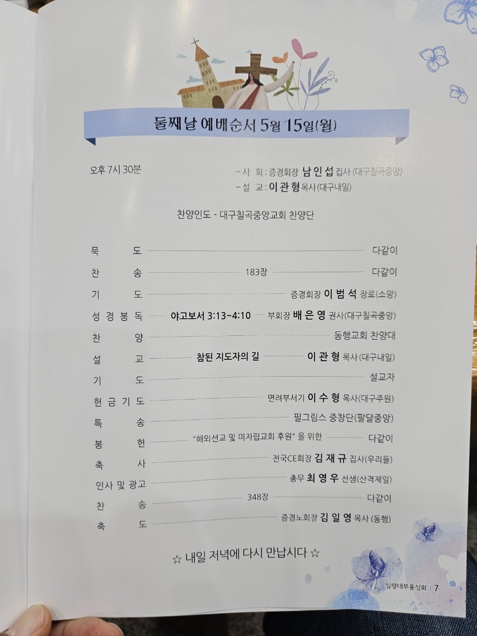 ♤대경CE 심령대부흥성회♤ [필리핀 새희망의 길 교회, 대신대 신학생, 미자립교회(풍성한,칠곡남부, 은혜샘물) 후원을 위한] 일시:2023년5월14일(주일) 오후3시 ~16일(화)오후7시30분 장소:대구칠곡중앙교회 (김동식 목사시무) 대구광역시 북구 구암로15길14 #둘째날 # #로컬행사 찬양인도: 대국칠곡중앙교회 찬양단 둘째날 예배인도: 증경회장 남인섭 집사 (칠곡중앙) 기도: 증경회장 이범석 장로(소망) 성경봉독: 부회장 배은영 집사 (대구칠곡중앙) 찬양: 동행교회 찬양단 설교: 야고보서 3장13절~4장10절 "참된 지도자의 길" -이관형 목사(대구내일)- 헌금기도: 면려부 서기 이수형 목사 (대구주원) 헌금특송: 필그림스 중창단 (팔달중앙) 축사: 전국CE회장 김재규 집사 (우리들) 인사및 광고: 총무 최영우 형제 (산격제일) 축도: 증경노회장 김일영 목사(동행) |