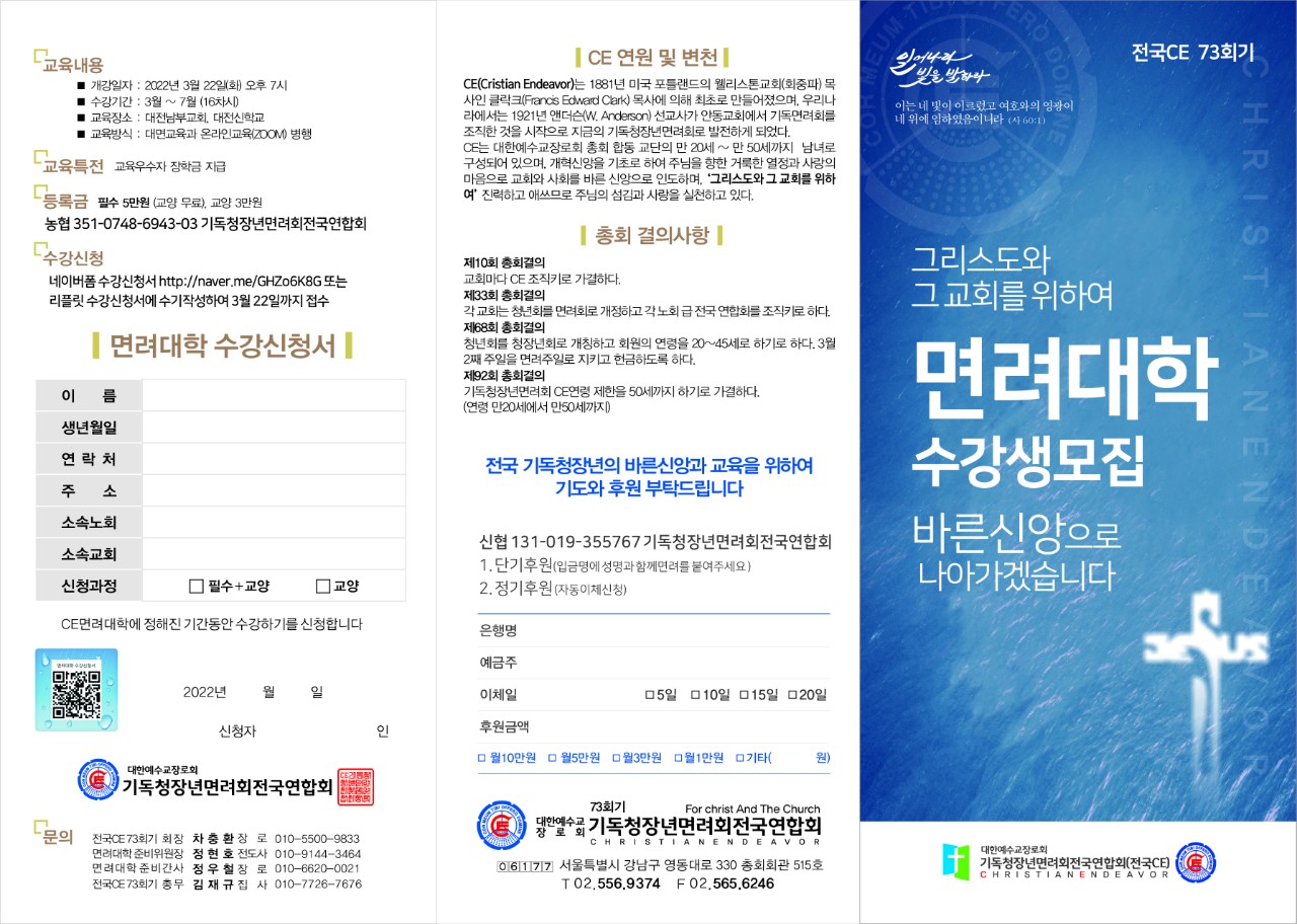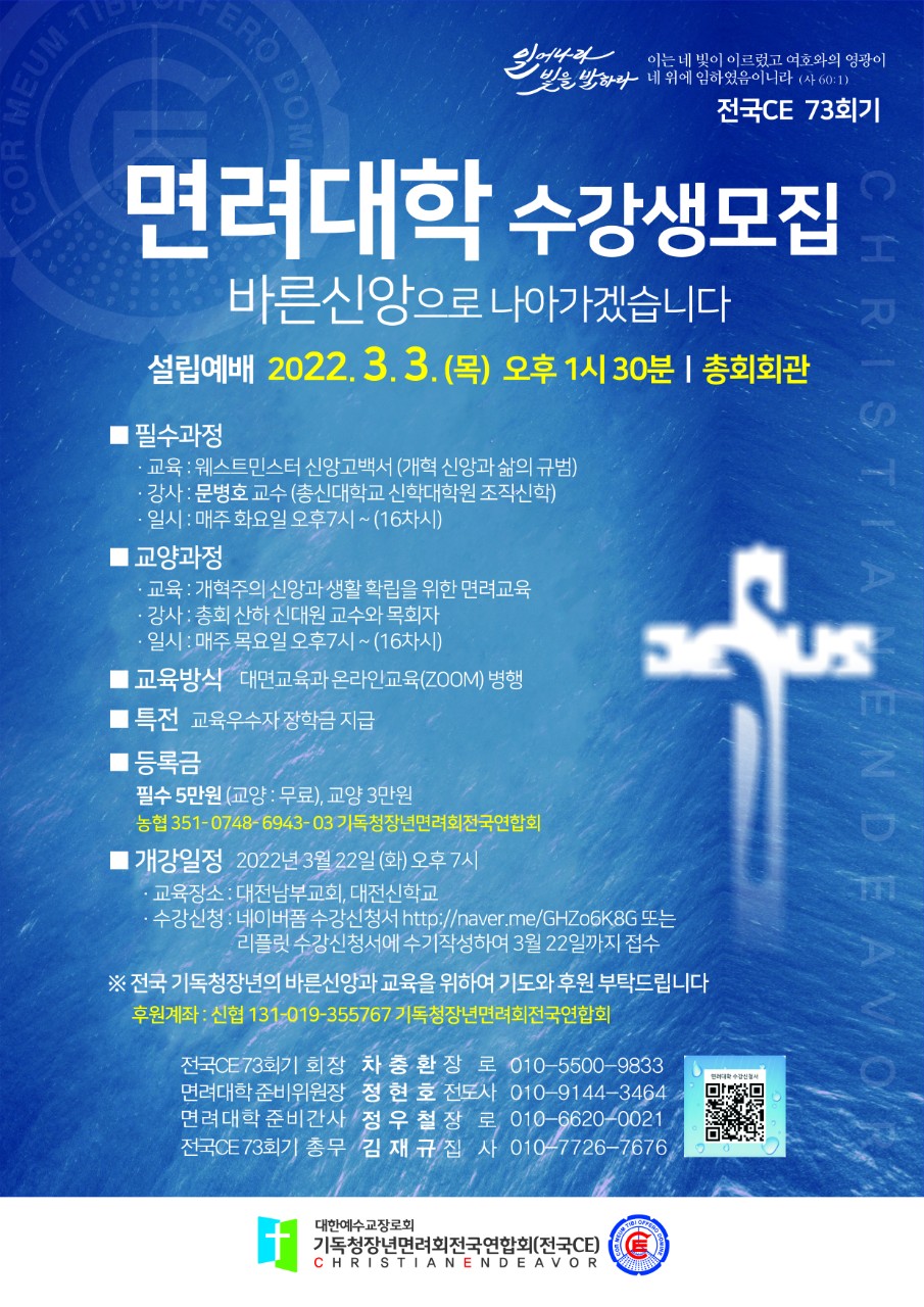 ![]() 그런즉 너희는 먼저 그의 나라와 그의 의를 구하라 그리하면 이 모든 것을 너희에게 더하시리라. <마태복음 6: 33> 샬롬! 펜데믹 시대의 어려움속에도 면려대학을 설립하여 개강하게 하신 하나님께 감사드립니다. 면려대학은 개혁신앙의 신조인 웨스트민스터 신앙고백서와 개혁신학을 위한 교육기관입니다. 전국에 주의 나라와 의를 구하는 성도님들이 면려대학을 통하여 성경에 계시된 신앙의 요체를 배우고 익혀 펜데믹 시대에 주의 증인되기를 소망합니다. 전국의 성도여! 말씀안에서 뜨겁게 기도하며 일어나 빛을 발하라 일어나라 빛을 발하라 이는 네 빛이 이르렀고 여호와의 영광이 네 위에 임하였음이니라 <이사야 60:1> <설립예배> 일정 : 3월 3일(목) 오후 1시30분 장소 : 총회회관 2층 예배실 <교육안내> 1.개강일자 : 3월 22일(화) 오후 7시 2.강의내용 1) 필수과정 : 개혁신앙의 신조인 웨스터민스터 신앙고백서 강의 2) 교양과정 : 펜데믹 시대의 개혁신앙, 성도의 삶, 예배, 기도, 교회, 청장년등과 관련된 교양과정 강의 3) 강의시간 : 매주 화요일과 목요일 오후7시부터 2시간 ~ 3시간씩 (16주) 4) 강의방식 : 대면과 온라인교육(ZOOM)병행 회 장 차충환 장 로 위원장 정현호 전도사 간 사 정우철 장 로 총 무 김재규 집 사