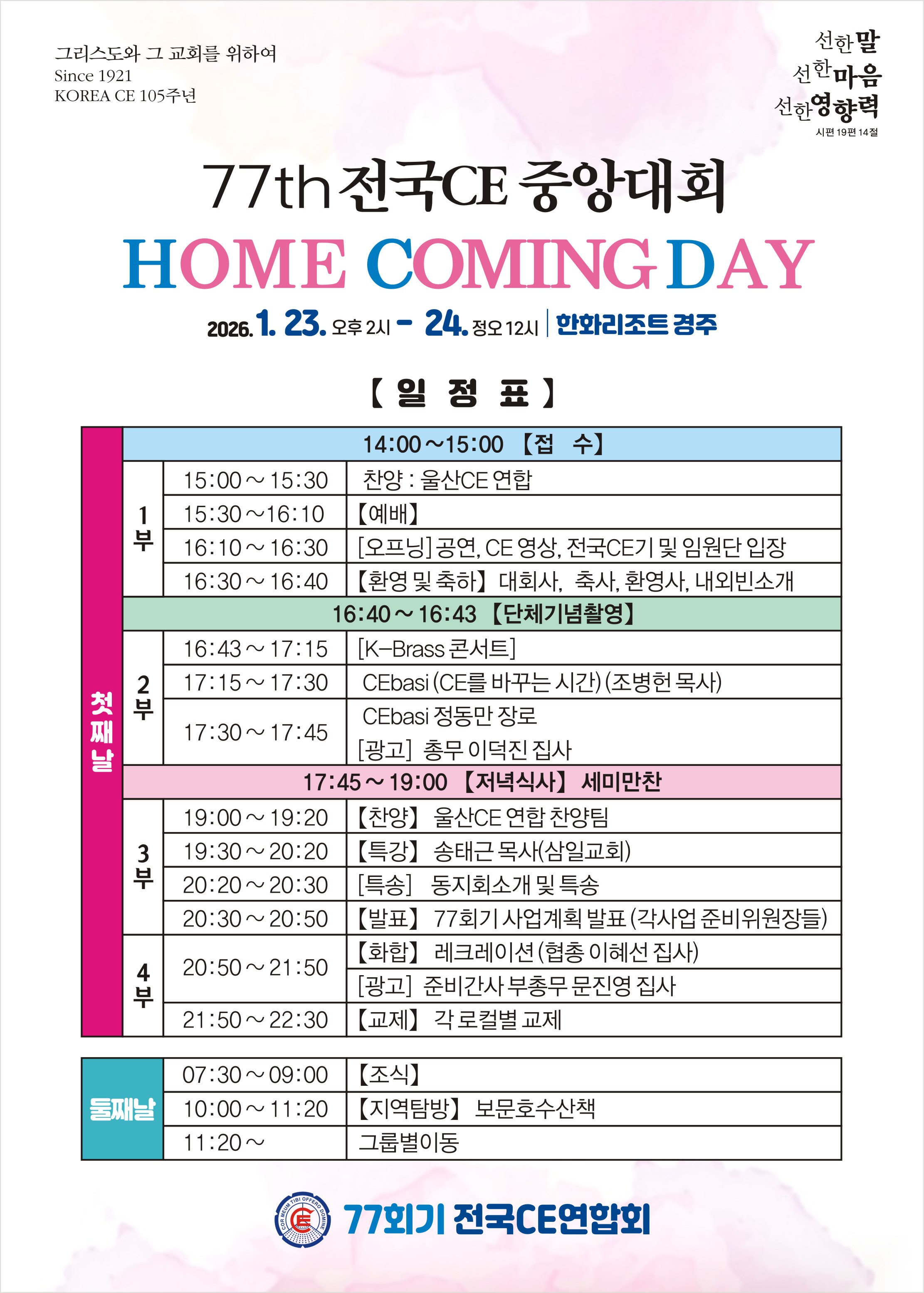 2026년 새해가 밝았습니다. 전국CE연합회는2026년 중앙대회를 '고향가는 날'로 준비하였습니다. 모든 중앙위원들,CE동지회, 로컬회장,임원들과 함께 로컬의 CE미래인재들을 초청하여 CE맨들의 하나됨, 함께함, 동지애를 느끼며, 옛이야기를 나누며 77회기전국CE출범을 함께 기뻐하고 축하하며 기도하는 자리를 마련하고자합니다. 꼭 오셔서 자리를 빛내주시기 바랍니다.
