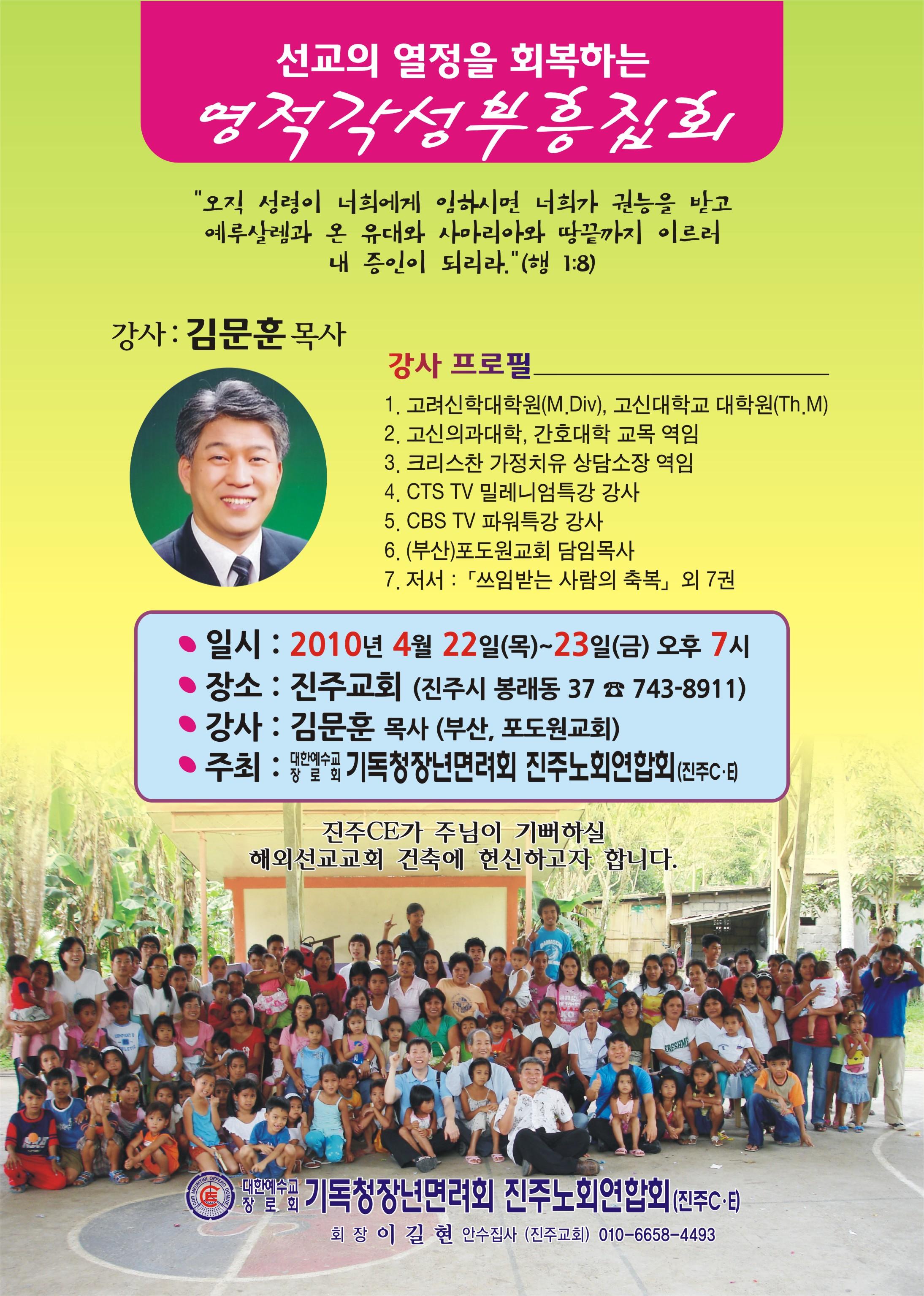 일시 : 2010년 4월 22일(목) ~ 23일(금) 찬양 19:00 예배 19:30장소 : 진주교회(송영의목사 시무) 진주시 봉래동 37번지강사 : 김문훈목사( 부산 포도원교회 담임목사)후원선교사 : 이종식, 하용선 선교사 (전 상미교회, 가산교회 담임)선교지 : 필리핀 라구나지역교회명 : 세상의 빛 붕아CE교회헌당식 예정일 : 6월29일(화)주최 : 진주CE연합회 ** 많은 참여를 소망합니다 **